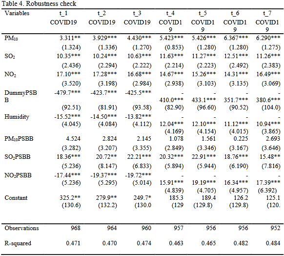 The next step was a robustness check or endurance test. In this step, the data was analysed with a similar model as pollutant datasets, which are PM10, SO2 and NO2. The researcher conducted this test to see how far the consistency of the influence of PM10, SO2and NO2 is towards the increase of COVID-19 cases from the first day until the seventh day after the observation. The result of the robustness check is shown in Table 4.